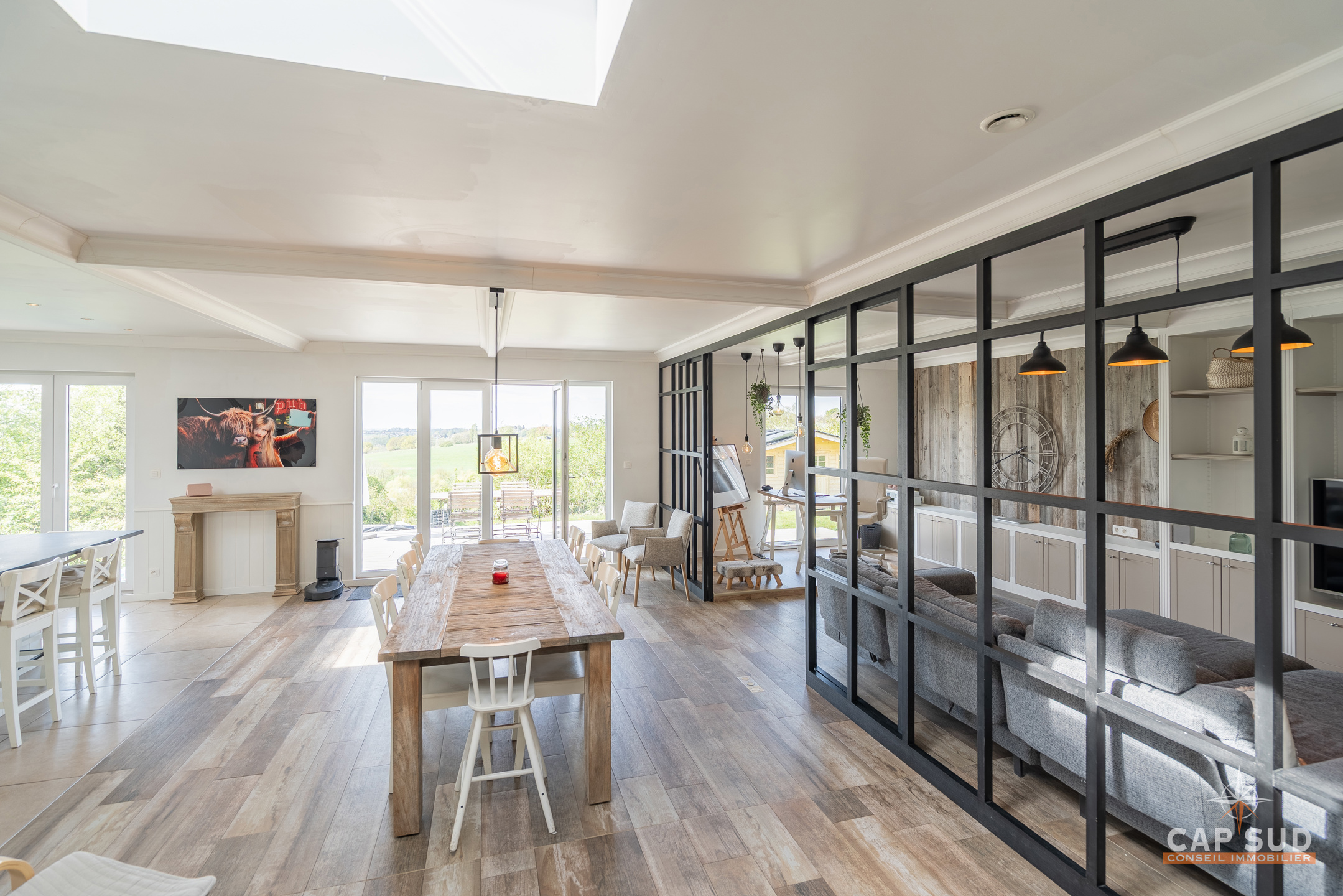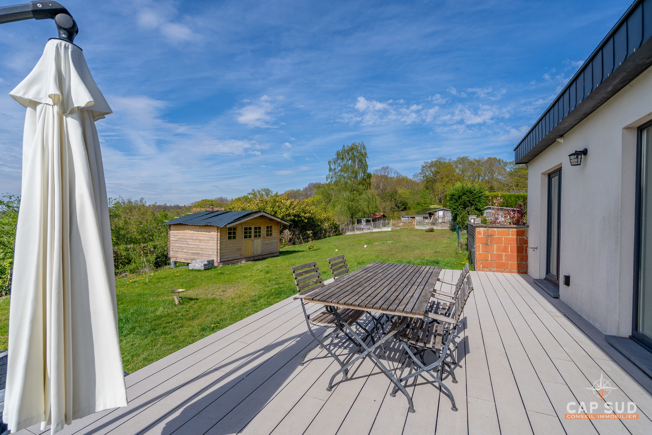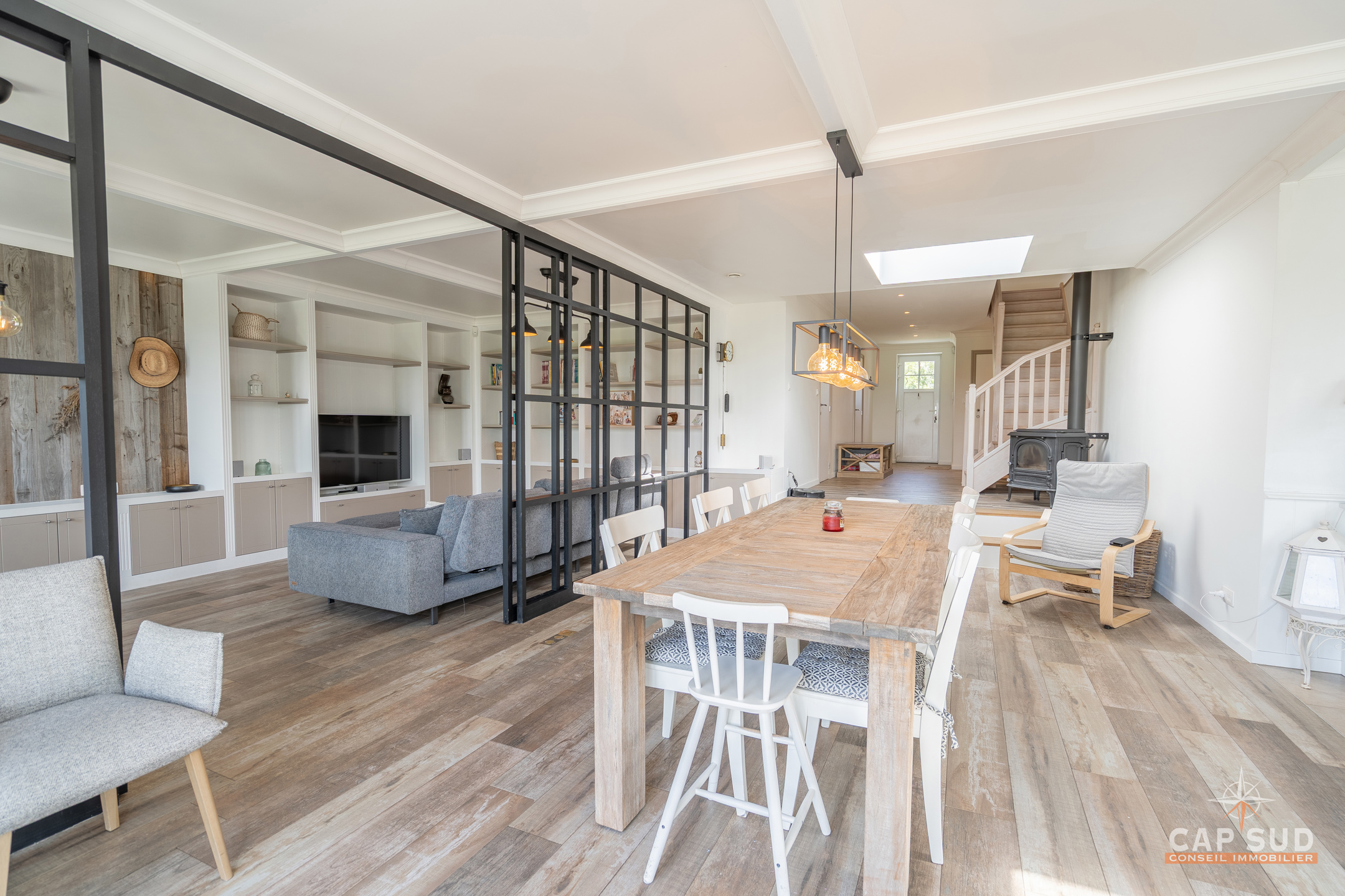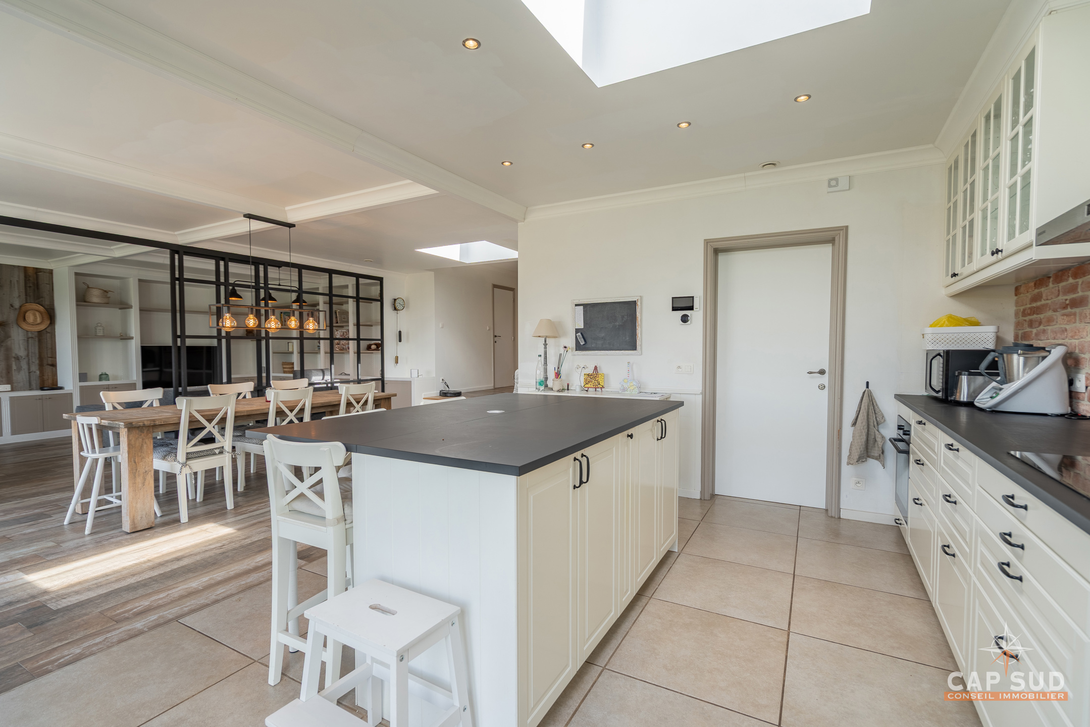 Dès l’entrée, un vaste hall vous accueille et s’ouvre sur un magnifique espace de vie de 80m², baigné de lumière, comprenant un séjour convivial et une cuisine super équipée. L’ensemble donne directement accès à la terrasse et au jardin, idéal pour profiter des beaux jours et des couchers de soleil.