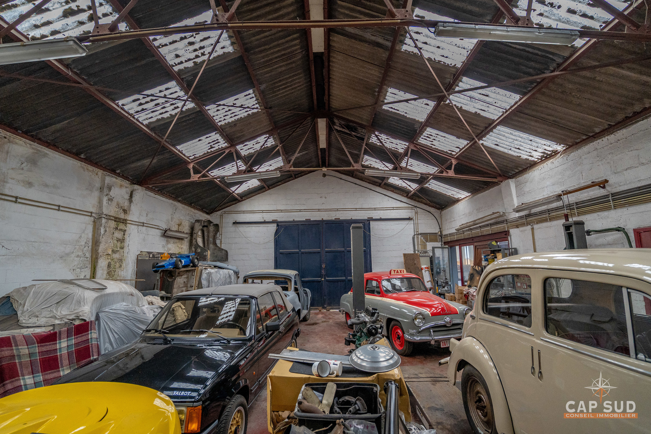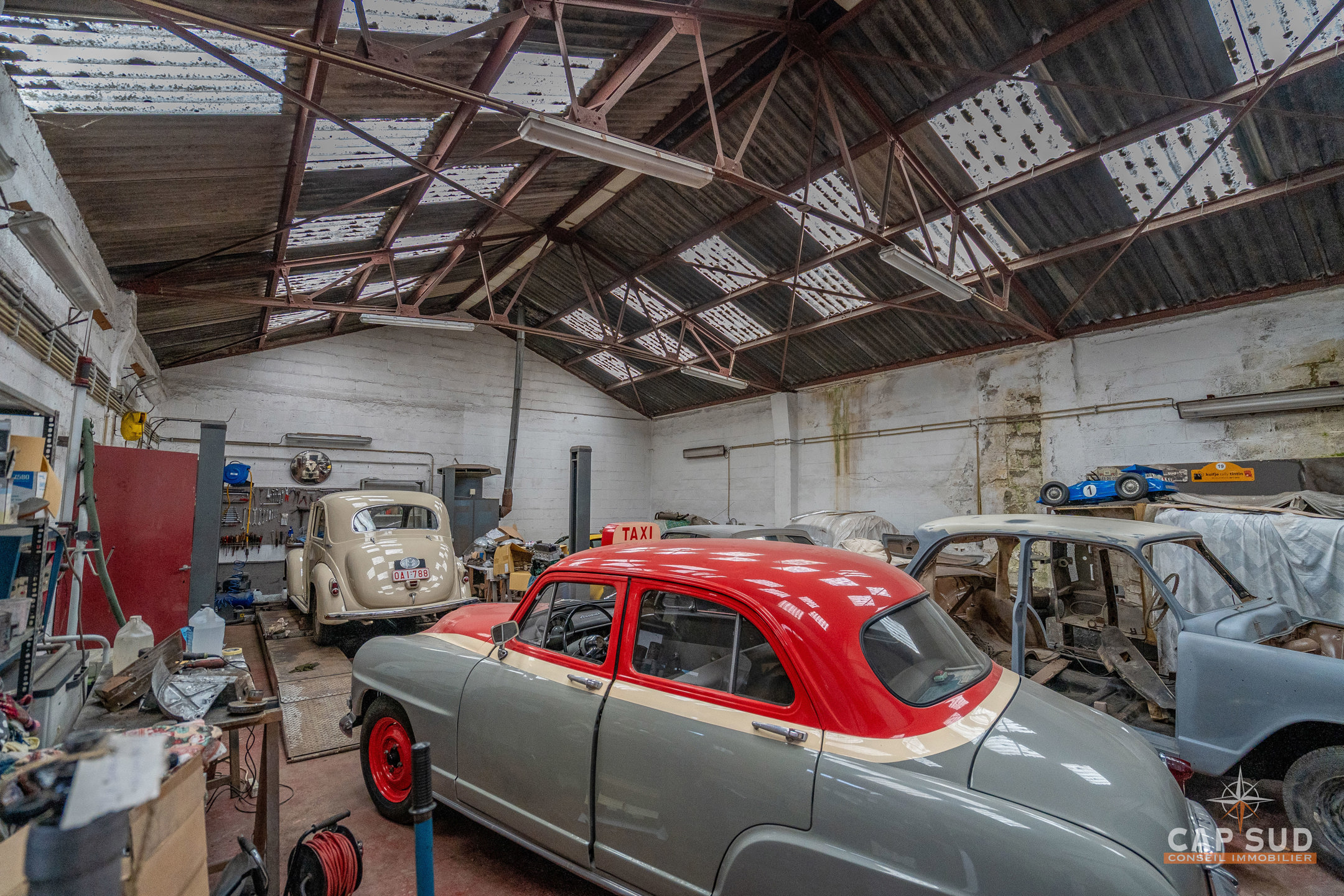 À droite du bâtiment principal, un vaste hangar de 171 m² actuellement utilisé comme garage complète l’ensemble. Celui-ci comprend également des espaces bureaux ou polyvalents, idéals pour une activité indépendante, un atelier ou du stockage.